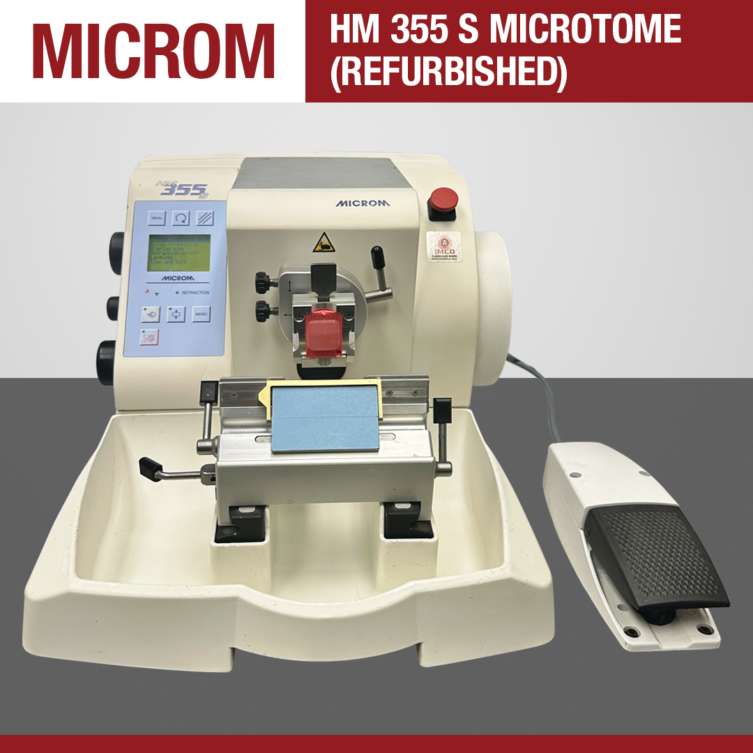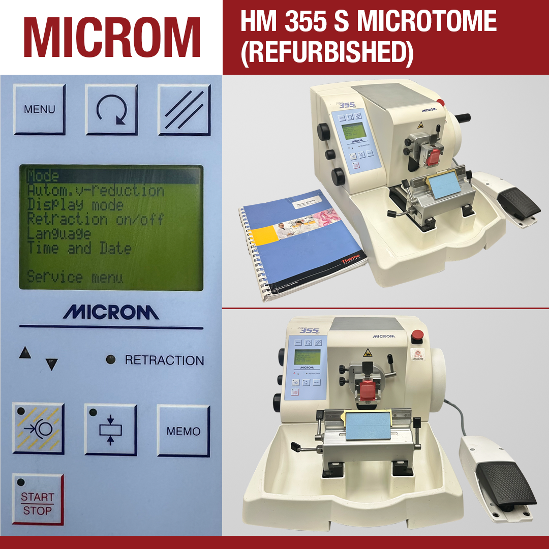 The Microm HM355 S is a reliable heavy-duty rotary microtome designed for efficient sectioning of paraffin and other hard specimens for biological, medicinal, and industrial applications. The system’s advanced ergonomic design features an integrated armrest for optimal user comfort, and a spacious section waste tray around the knife carrier for direct collection of section waste. Moreover, this high-functioning microtome can accommodate all specimen clamps and knife carriers of the rotary microtome HM 300 series.
