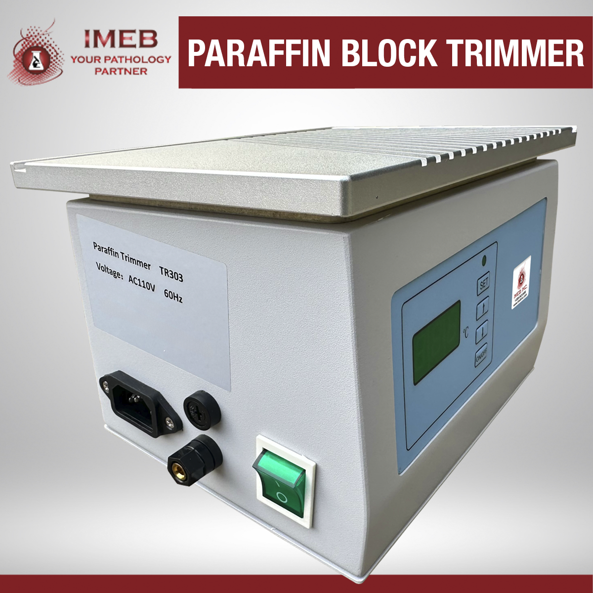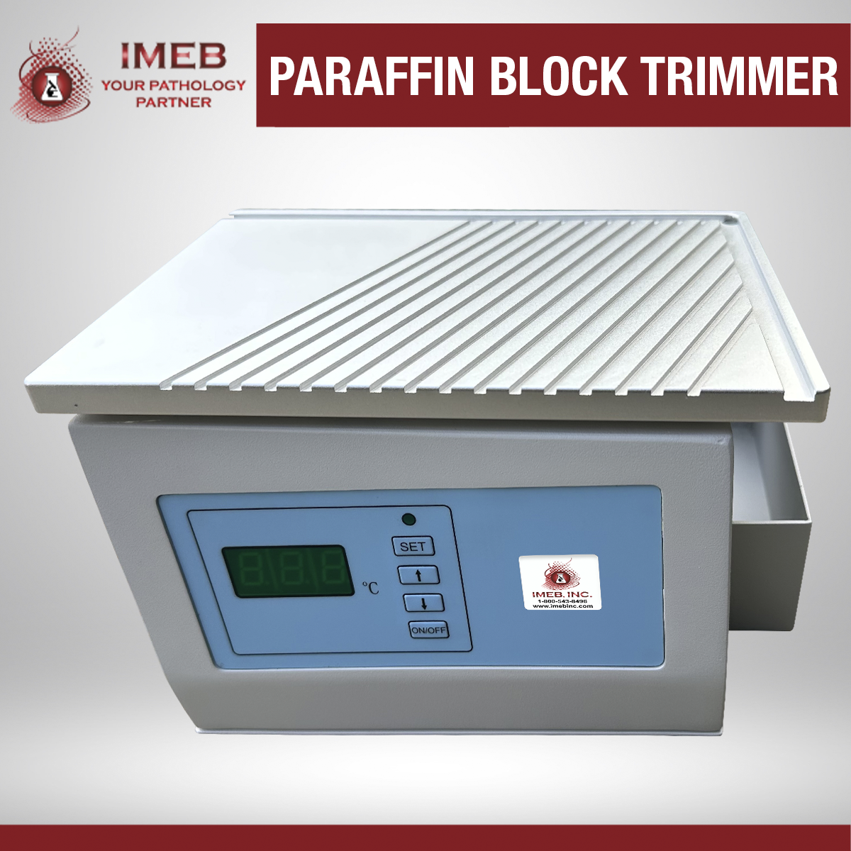 The block trimmer is an efficient appliance for removing excess paraffin from embedding tissue cassettes. Simply slide paraffin blocks across the heated grooved surface. Melted paraffin is shaved away to the disposable receptacle below. Preparing embedded tissue blocks for insertion into microtome quick-release clamps has never been easier or safer.