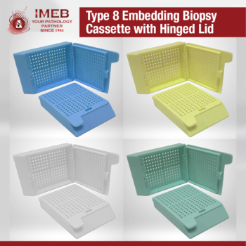 Biopsy cassettes: The special hinge holds the base and cover together and is strong enough for the hinge to open and close repeatedly. The lid can be removed or reinserted easily without losing specimens. Three frosted writing surfaces, including the 45° angle anterior face, are easy to write on.